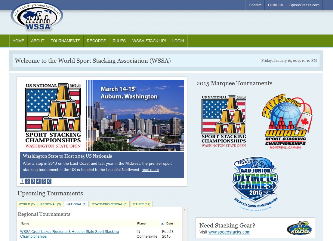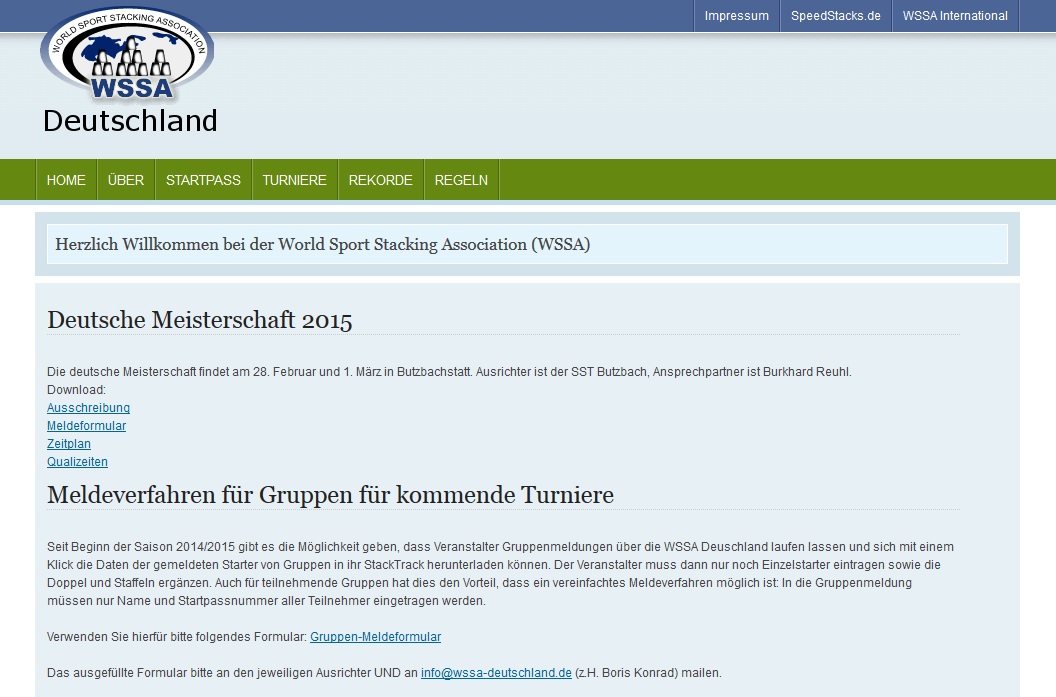 Die deutsche Homepage der World Sport Stacking Association. Die WSSA fördert die Vereinheitlichung und die Verbreitung des Sport Stackings weltweit. Diese Vereinigung dient als leitende Institution für die Sport Stacking Regeln und Bestimmungen, sie stellt einen einheitlichen Rahmen für Sport Stacking Veranstaltungen bereit und legt Sport Stacking Wettbewerbe und Rekorde fest.