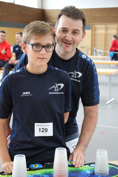 Bei den 8. Bayrischen Sport Stacking Meisterschaften in Speichersdorf erzielte das Team des SST Butzbach zahlreiche Erfolge. Alle Einzeldisziplinen seiner Altersklasse gewann Maxi  Gemmer, unser Bild zeigt ihn zusammen mit Vater Mario nach dem Gewinn des Eltern/Kind-Doppels.