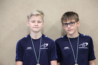 Toll lief es bei den 13/14jährigen Mädchen für Lisa Ortwein, die sich hinter Deutschlands derzeit bester Stackerin Finja Hollin (Quickborn) in allen Einzeln Platz zwei sicherte. Besonders freute sich Lisa über ihre persönliche Wettkampfbestzeit von 6,847 sec. im Cyclefinale. Im Doppel gewann sie zusammen mit Sophie Förster (Boffzen) ebenfalls Silber, mit der Staffel „Jump Street“ sogar Gold. Maxi Gemmer erwischte bei den 13/14jährigen Jungen einen Superstart und konnte mit sehr guten Zeiten die Disziplinen 333 (1.969 sec.) und 363 (2,333 sec.) gewinnen. Im Cycle gewann er die Silbermedaille. Ebenfalls in dieser Altersklasse startete Benno Harlander, der gleich eine Bronzemedaille in der Disziplin 333 gewann, in 363 und im Cycle trotz guter Leistungen als Vierter aber das Treppchen knapp verpasste. Ein tolles Ergebnis gelang den beiden gemeinsam in ihrem zweiten Doppelwettkampf: Mit sehr guten 7,735 sec. wurden sie nicht nur Erste ihrer Altersklasse, sondern belegten damit auch Platz drei in der Gesamtwertung aller Doppel der Tageswertung. Mit der Staffel „Jump Street“ holte Benno seine zweite Goldmedaille des Tages. Im Eltern-Kind-Doppel konnten sich Mario und Maxi Gemmer für das Finale qualifizieren und beendeten den Wettbewerb auf Platz 3.