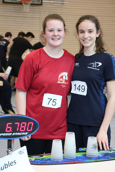 Bei den 13/14jährigen Mädchen gewann Lisa Ortwein eine komplette Medaillensammlung: Bronze erstapelte sie in 333 und im Cycle, Silber in 363 und Gold im Doppel an der Seite von Finja Hollin. Mit 7,260 sec. erreichten sie die drittschnellste Zeit des Tages und durften somit im Bühnenfinale nochmals antreten. Hier gelang den beiden mit 6,780 sec. eine umjubelte neue Bestzeit, die sie auf Platz 1 der Doppel-Tageswertung katapultierte.