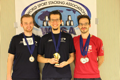Einen Durchmarsch aus Sicht des SST Butzbach gab es bei den Masters 1 (25-34 Jahre) durch Mohammed Sahraoui und Ruben Kehl. Moha gewann 333 vor Ruben, in 363 drehte Ruben den Spieß um und trug sich mit 2,528 sec. in die deutsche Rekordliste ein. Im Cycle hatte wieder Moha die Nase vorn. Ein neuer Weltrekord gelang den beiden zusammen im Doppel, die neue Bestmarke liegt bei 8,459 sec. Tanja Buchholz siegte in ihrem ersten Wettkampf dieser Altersklasse weiblich in allen drei Einzeldisziplinen und gewann zudem an der Seite von Sabrina Obenlüneschloß die Silbermedaille im Doppel. In der Staffel starteten die drei SST-Stacker zusammen mit Rebecca Ernst (Achim) und waren auch hier nicht zu schlagen.