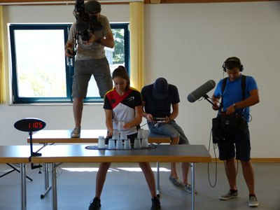Am morgigen Sonntag unternimmt Lisa Ortwein vom Sport Stacking Team Butzbach (2.v.l.) einen Rekordversuch im Ausdauerstacken im Rahmen des ZDF-Fernsehgartens. Am Donnerstag wurde Familie Ortwein von einem ZDF-Fernsehteam besucht, um Aufnahmen für einen Filmbeitrag zu machen.
