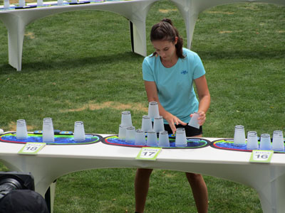 Bildtext: In der Live-Sendung „ZDF-Fernsehgarten“ stapelte sich die Butzbacherin Lisa Ortwein am Sonntag in die Herzen der Zuschauer. In ihrem spektakulären Rekordversuch gelang es Lisa, innerhalb von 90 Sekunden 27mal die Stapelfolge 363 auf- und wieder abzubauen, womit sie die Rekordvorgabe von 25 Stacks deutlich überbot. Beim Publikumsvoting ließ Lisa mit 43 Prozent aller Stimmen ihre Mitbewerber klar hinter sich und wurde von Moderatorin Andrea „Kiwi“ Kiewel als Tagessiegerin der Rekordchallenge gekürt (vgl. Bericht).