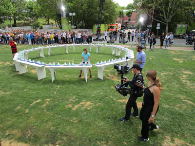 Für Brathering lief es in der Show nicht so gut, er scheiterte klar an der Vorgabe 150 Punkte mit Dartpfeilen zu erzielen. Für Lisa wurde ein Rondell aus Tischen aufgebaut, das 30 Stackmatten mit Speed Stacks Wettkampfsets aufnehmen konnte. Familie Ortwein war natürlich vollzählig zur Unterstützung angereist. Vater Michael, der 1. Vorsitzende des SST Butzbach, Mutter Sandra, ebenfalls langjähriges Vorstandsmitglied im SST und Schwester Lara halfen beim Aufbau des Settings und sorgten für den nötigen Rückhalt. Der zweite Rekordversuch mit dem Gullydeckel gelang, statt der avisierten fünf schaffte es der Kandidat sieben Sektflaschen unbeschadet zu öffnen. Der Vorteil für Lisa: Dieser Versuch lief unmittelbar neben dem Stackgelände ab, so dass sie sich die Abläufe schon einmal genau einprägen konnte. Während Kandidat Nummer drei es schaffte, unter Wasser fünf Luftballons aufzupusten und so zu verschließen, dass sie an die Oberfläche trieben, absolvierte Lisa einen letzten Trainingsdurchgang.