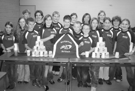 Einen Weltrekordversuch in der 3-6-3-Zeitstaffel werden diese Sport Stacker des neu gegründeten Sport Stacking Teams Butzbach am Samstagabend ab 20.15 Uhr in der Sendung „Guiness World Records“ „Die größten Weltrekorde“ bei RTL unternehmen. Moderator Oliver Geissen und Guinness-Pate Henry Maske werden die Kinder unterstützen, die wir bei den Dreharbeiten zu dem Einspielfilm fotografierten. Auf Rekordjagd gehen am Samstag (vordere Reihe v.l.) David Wolf, Annika Weinmann, Christoph Sauer, Timo Reuhl; (hintere Reihe v.l.) Marcus Reitz, Miriam Christ, Tanja Buchholz und Robin Stangenberg.
