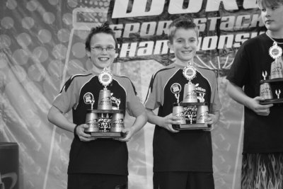 Inzwischen hatte für David Wolf das Finale 3-3-3 bei den 10jährigen gewonnen. Mit 2,27 Sek. hatte er sich als Schnellster der Vorrunde den letzten Startplatz gesichert. Als er sich auf seinen ersten Finalauftritt vorbereitete, stackte Ian Dowdy (Colorado,USA) mit 2,72 Sek. die bis dahin beste Zeit. Doch David hatte kein Auge für die Konkurrenz, konzentrierte sich ganz auf seine Bewegungsabläufe und baute die Dreierpyramiden so sensationell schnell auf und ab, dass Schiedsrichter und Zuschauer staunend Beifall klatschten. Mit 2,28 Sek. bestätigte er seine Vorkampfleistung, wie sich später herausstellte war dies die schnellste 3-3-3-Zeit aller Finalteilnehmer, so dass David nicht nur Weltmeister bei den 10 jährigen, sondern auch noch Overall-Sieger (Meister aller Klassen) wurde! Der Kleinste des deutschen Teams war der Größte und er setzte im 3-6-3-Finale noch einen drauf, denn hier blieben die Uhren bei 2,75 Sek. stehen, nur drei Hundertstel über dem Weltrekord von Emily Fox! Auch hier Gold, auch hier Tagesbestzeit aller Teilnehmer, auch hier der goldene Overall-Pokal für David Wolf!