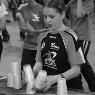 Bei den 13- und 14jährigen war die größte Leistungsdichte zu verzeichnen und so musste so mancher gute Stacker seine Finalträume begraben, obwohl er eine gute Vorrundenleistung auf die Matte gezaubert hatte. So erging es auch einigen der sechs Starter vom SST Butzbach. Isabelle Brauneis kam mit eigentlich guten 3,03 Sek (3-3-3), 3,60 Sek. (3-6-3) und 10,80 Sek. (Cycle) nicht unter die besten 20. Ann-Katrin Wolf (Cycle:10,15 Sek.) und Annika Weinmann (Cycle 9,11 Sek.) schafften mit superschnellen Zeiten (2,62 Sek. und 2,46 Sek.) den Einzug ins 3-3-3-Finale. Im Cycle brauchte man hier eine Zeit unter 8,85 Sek. für einen Platz unter den Top Ten! Dies gelang Jil Rück mit 8,72 Sek., Christoph Sauer mit 8,43 Sek. und Robin Stangenberg mit 7,87 Sek. Christoph und Robin qualifizierten sich auch für die anderen beiden Finals und sorgten damit für eine gute Präsenz der schwarz-orangenen deutschen Trikotfarben in dieser Altersklasse.