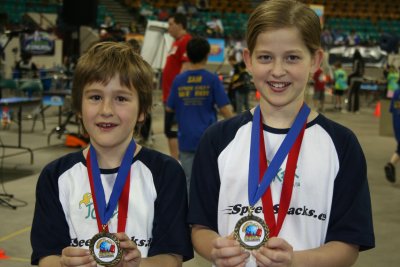 Zu den Favoriten bei den 8jährigen zählte Ryan Powell vom SST, der im Training fabelhafte Cyclezeiten gestackt hatte, in der Vorrunde nach Fehlern aber ausgerechnet in seiner Paradedisziplin unglücklich ausschied. Dafür hielt er sich in den anderen Disziplinen schadlos, wurde 7. in 3-3-3 und gewann danach den Weltmeistertitel in 3-6-3 mit sehr guten 3,08 Sek. Das Tüpfelchen auf dem i aber war das Doppel mit Klara Härtl, die sich noch mit Mühe durch die Vorrunde gezittert hatten, im Finale mit 10,36 Sek. souverän Weltmeister mit neuem Weltrekord wurden.