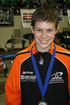 Ähnlich wie David hatte auch Timo Reuhl bei den 12jährigen eine sehr gute Vorrunde gestackt, doch mit Joel Brown (USA) traf er auf einen gleichwertigen Konkurrenten. Timo gewann mit großer Nervenstärke die 3-3-3 und 3-6-3 jeweils im letzten Versuch, Joel drehte im Cycle den Spieß um und unterbot Timos zwischenzeitlichen Weltrekord von 7,56 Sek. noch um 3 Hundertstel. Colin Stangenberg gewann zweimal Bronze, Georg Härtl belegte im Cycle mit 11.13 Sek. Platz 8.