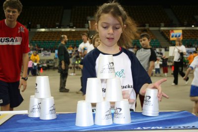 Blieb noch das Finale des International Stack Challenge, für das sich die beiden US-Teams und die beiden deutschen Teams qualifiziert hatten. Im Halbfinale trafen USA red und USA blue sowie Germany I und Germany II aufeinander, damit ein internationales Finale gewährleistet war. USA red und Germany I setzten sich durch und traten um den Titel des Nationenchampions gegeneinander an. Im ersten Rennen zeigten sich Timo Reuhl, David Wolf, Robin Stangenberg und Miriam Christ noch irritiert von den laut skandierten „USA“-Anfeuerungsrufen des Publikums, das natürlich seine Lieblinge siegen sehen wollte. Doch der 1:0-Rückstand wurde mit konzentriertem 2. Durchgang ausgeglichen. Im entscheidenden Rennen legte Timo gleich eine sichere 7er-Zeit vor und als David unbeirrt weitermachte, verlor Rexi Rindone (USA) die Nerven und ein Becher fiel ihr zu Boden. Damit brauchten Robin und Miriam nur sicher zu Ende zu stacken und der Championtitel ging unter dem Jubel der Fans ebenfalls nach Deutschland.