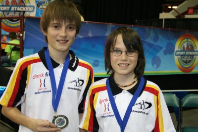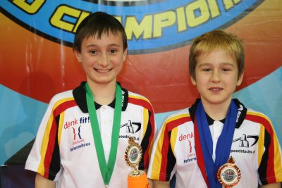 Lief es in den Einzeln eher durchwachsen, so stellten die deutschen Doppel einmal mehr ihre Ausnahmestellung unter Beweis. Ryan Powell und Leon Reuhl waren als Zweite der Vorrunde in der Altersklasse 12 und jünger ins Finale eingezogen und konnten zusehen, wie ihre US-Konkurrenten 10,40 Sek. vorlegten. Nach einem Fehler im ersten Versuch, stackten sie schnell und sauber durch, stoppten nach 9,61 Sek. ihre persönliche Bestzeit und wurden strahlende Weltmeister!
