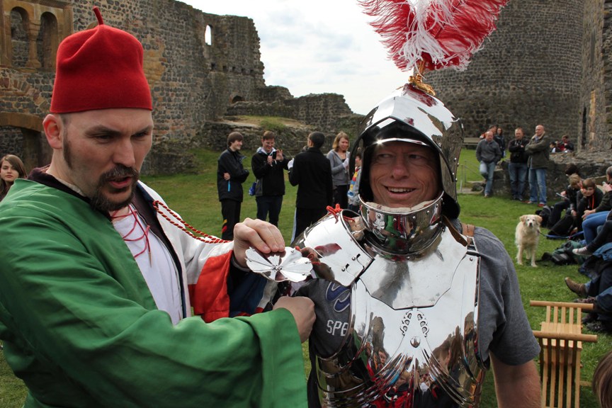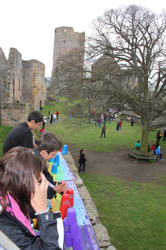 Butzbach (br) - Zum Auftakt des internationalen Rahmenprogramms rund um die Sport Stacking Weltmeisterschaften, die am kommenden Wochenende in der Mehrzweckhalle Kirch-/Pohl-Göns stattfinden, trafen sich am Dienstagnachmittag die Teilnehmer aus Australien, Kanada, Neuseeland, Großbritannien, Thailand, den USA und Deutschland in Münzenberg. Nach einem Spaziergang durch die Fachwerkstraßen begrüßte Andre Pfeiffer-Perkuhn die internationalen Gäste und führte sie zur Burgruine, wo er mit seiner Familie einige Aktionen mit verschiedenen Utensilien, Rüstungen und Waffen aus der Hochzeit der Burgritter vorbereitet hatte.