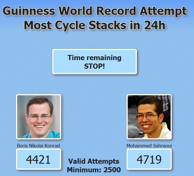 Am 18. und 19. Oktober 2013 bereits trafen sich Boris Konrad und Mohammed Sahraoui in Stuttgart, um in einem einzigartigen Sport Stacking Duell gegen einander anzutreten. Das Ziel: möglichst viele Cycles in 24 Stunden stacken. Die Mindestvorgabe belief sich hierbei auf 2500 Cycles. Begonnen wurde am Freitag, dem 18. Oktober um 13:15 Uhr.