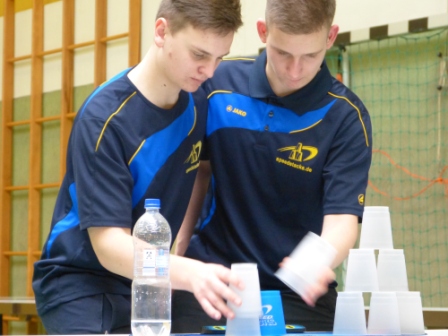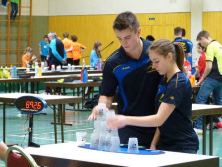 Butzbach (br) - Am 17.01. trafen sich Deutschlands Sport Stacker zum ersten Turnier des Jahres 2015 bei den Rhinemosquitos in Stockstadt am Rhein. Herausragendes Ergebnis des Turniers war der neue Doppelweltrekord durch Son Nguyen und Nicolas Werner, die im Stack Off ihren Cycle nach 6,209 sec. stoppten.