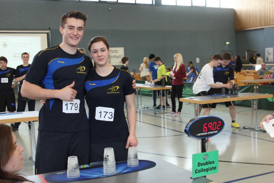 In den Doppelwettbewerben war das Highlight der Veranstaltung der Weltrekord durch Marie Henrich und Timo Reuhl vom SST Butzbach. In der Altersklasse "Open" - hier tritt ein Erwachsener gemeinsam mit einem Jugendlichen an - stand die Weltrekordmarke der US-Amerikaner Zhewei Wu und Chandler Miller bei 7,153 sec.. Marie und Timo starteten mit einer Zeit von 7,469 sec. und hatten damit schon den deutschen Meistertitel gewonnen. Somit hatten sie zwei Versuche, um volles Tempo und damit auch Risiko zu gehen. Und gleich der erste Versuch gelang schnell und fehlerfrei, sie stoppten gemeinsam die Uhr nach 6,902 sec. - Weltrekord!