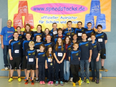 In der Zeitstaffel konnten sie mit 14,227 sec. die schnellste Zeit des Tages vorlegen und wurden damit Deutscher Meister über alle Klassen hinweg. Zweitschnellste Staffel der DM war das Team "SST Open" mit Timo Reuhl, Jonathan Kettler, Lukas Drexelius, Mohammed Sahraoui und Leon Reuhl, mit 14,529 sec. lagen sie nur einen Hauch hinter ihren Vereinskameraden. Bei den Turnierstaffeln war das Team nur langsam in Schwung gekommen und musste mit Bronze in 363 und Silber im Cycle zufrieden sein, in der Zeitstaffel aber blieben sie fehlerfrei und gewannen die Goldmedaille. Die "SST Collegiates" mit Tanja Buchholz, Lisa Fuhr, Jacqueline Nalasko, Henrike Kärchner und Ruben Kehl freuten sich über Silber in der 363-Turnierstaffel und Bronze in der Cycle-Staffel ihrer Altersklasse. Eine Silbermedaille in der Zeitstaffel gewannen auch die "SST Youngsters" mit Lisa Ortwein, Benno Harlander, Maximilian Gemmer, Alexandra Mellmer und Christopher Sinkovic in der stark besetzten Ak 12 Jahre und jünger. An der Verbesserung des Weltrekordes in der Zeitstaffel der Masters 3 war aus SST-Sicht Ilona Reuhl beteiligt, die zusammen mit Wolfgang Bleischwitz, Holger Müller, Richard Mellmer und Robert Sinkovic die neue Bestmarke auf 20,515 sec. schraubte.