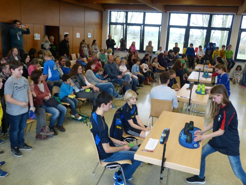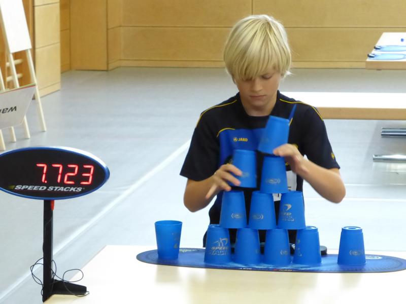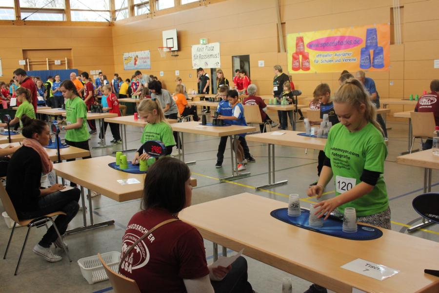 Am 26.09.2015 trafen sich erstmals über 30 Sport Stacking Anfänger in der Mehrzweckhalle Nieder-Weisel, um ihr erst kürzlich erlerntes Können unter Beweis zu stellen. Das SST Butzbach e.V. – Deutschlands führender Sport Stacking Verein- hatte hierzu eingeladen, um Neulingen in dieser Sportart die Gelegenheit zu geben, in einem neuen Turniermodus gegeneinander anzutreten. Sieben Teams folgten dieser Einladung und somit starteten Kinder im Alter von 8 – 14 Jahren aus Butzbach, Biebesheim, Trennfurt, Mittenaar, Sinn und Ehringshausen um die Wette.