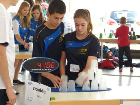 Auch zwei Neulinge starteten zum ersten Mal auf einem Qualifikationsturnier für die Deutschen Meisterschaften 2016, Hannah Wetteborn und Victoria Zimmer, die zwar beide noch nicht in ein Finale gelangen konnten, aber mit zufrieden stellenden Zeiten knapp an der Finalrunde scheiterten, im Doppel gelang den beiden sogar eine persönliche Bestleistung von 13, 877 Sekunden, welche aber auch hier leider nicht zum Finaleinzug reichte. Auch in der Staffel zusammen mit zwei Stackern aus Eislingen verpassten sie den Einzug nur um einen Platz. Die erneute Gelegenheit hierfür bekommen die beiden aber – wie alle anderen Stacker natürlich auch – bei den Weidig Open, die das SST am 14.11. in der Mehrzweckhalle Butzbach / Nieder-Weisel austragen wird, nachdem sie eine Woche zuvor an den bayerischen Meisterschaften teilnehmen werden.