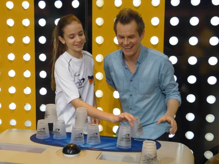 Die Aufzeichnung hierzu fand bereits am 30.11.beim SWR Göppingen/BW statt, wozu die beiden Mädels schon vor einigen Wochen eingeladen wurden. In der Sendung wurden Bilder von Wettkämpfen gezeigt, sie durften die Sportart Sport Stacking erklären und demonstrieren. Vor allem aber auch den Studiokindern und auch den Moderatoren beibringen. Nachdem jeweils 2 Kinder einer Klasse die einfachste Disziplin 333 erlernt hatten, genauso wie Malte Arkona und Muschda Sherzada, die durch die Sendung führten, traten die Teams in einem Staffelwettbewerb gegeneinander an, natürlich unterstützt durch die beiden mehrmaligen deutschen und Welt - Meisterinnen. Anschließend standen Shanice und Lisa noch für zwei Quizfragen zum Thema Sport Stacking zur Verfügung.