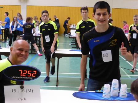 Überaus stolz war auch Manuel Schichau bei den gleichaltrigen Jungen auf seine Ergebnisse, insbesondere auf seine Wettkampfbestzeit von 7,252 sec. im Cycle. Hier gewann Manuel ebenso Silber wie in 333, mit Platz 4 in 363 rundete er einen sehr guten Wettkampftag ab. Dazu kam im Doppel der Finaleinzug gemeinsam mit Kim Varnju (Stuttgart). Die beiden steigerten sich auf 10.026 sec. und wurden Zweite.