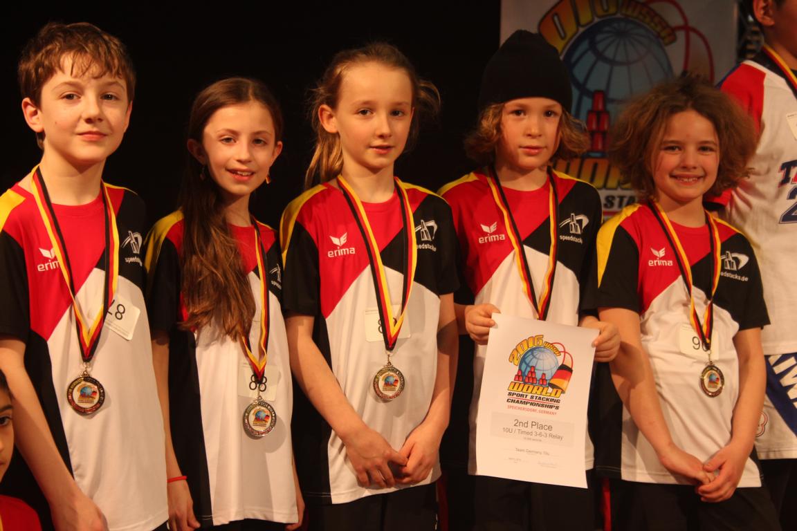 Bei den Kindern und Jugendlichen gab es die ersten Jubelschreie im Sektor der 10jährigen, denn hier hatte die deutsche Staffel im 363-Wettbewerb die favorisierten "Taiwan Lions" in Schach gehalten und in einem Herzschlagfinale den Weltmeistertitel gewonnen. Zu den Stackern gehörten neben Lara Ortwein vom SST Butzbach Pablo Schleussner, Kaja Schilcher, Katharina Reiß und Christopher Sinkovic. Gecoacht wurde das Team von Ilona Reuhl. Im Cycle trafen die beiden Teams im Finale erneut aufeinander, diesmal jedoch gab es einen klaren Sieg für Taiwan, Platz 3 und 4 gingen an Teams aus Malta.