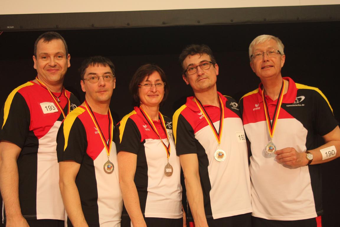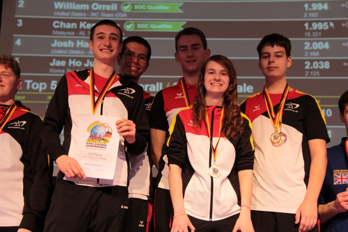 Butzbach (br) - Einen äußerst erfolgreichen Auftakt feierte das deutsche Team bei den Sport Stacking Weltmeisterschaften in Speichersdorf/Bayern. Am ersten Wettkampftag wurden die Weltmeister in den Staffelwettbewerben unter den 21 teilnehmenden Nationen ermittelt. Gegen sehr starke Konkurrenz insbesondere aus Südkorea, Malaysia, Taiwan und den USA gelang den deutschen Staffelteams die stolze Bilanz von 12 Gold-, 10 Silber und 4 Bronzemedaillen. Stacker des heimischen SST Butzbach waren an 7 Gold-, 9 Silber und 3 Bronzemedaillen beteiligt.