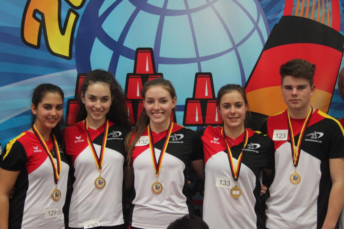 Einen unglaublich spannenden Wettkampf erlebten die Zuschauer in der Altersklasse 16 Jahre und jünger, wo die Rekordzahl von 13 Teams an den Start ging. Sehr gut hielt sich WM-Debütant Manuel Schichau vom SST Butzbach, der mit dem "Newcomer"-Team gut mithalten konnte, allerdings nicht in die Medaillenränge kam. Die beiden anderen deutschen Teams schafften es mit großer Sicherheit und Konstanz in die Runde der letzten Vier. Im Halbfinale schlug das Team "Wunschlos glücklich" mit Marie Henrich und Shanice Klingelhöfer (beide SST Butzbach), die gemeinsam mit Luis Grasser, Michelle Gosslau und Carmen Knie an den Start gingen, das zweite deutsche Team und zog ins Finale ein. Im zweiten Halbfinale setzte sich Südkorea knapp gegen Malaysia durch. Nachdem das zweite deutsche Team gegen Malaysia Bronze gewonnen hatte, schien Südkorea einem deutlichen Sieg gegen "Wunschlos Glücklich" entgegenzusteuern, leistete sich dann aber einen Wechselfehler, so dass ein alles entscheidendes drittes Match ausgetragen werden musste. Hier zeigten die Deutschen Nervenstärke und als bei Südkorea ein Becher vom Tisch fiel, brachte Marie Henrich den Durchgang sicher zu Ende und sprang jubelnd ihren Teamkameraden in die Arme, die "wunschlos glücklich" einen sensationellen Weltmeistertitel feierten! Im Cycle zeigten alle favorisierten Teams Nerven und leisteten sich Stackfehler, so dass das sichere deutsche Team 16u einen Überraschungscoup landete und Weltmeister wurde.