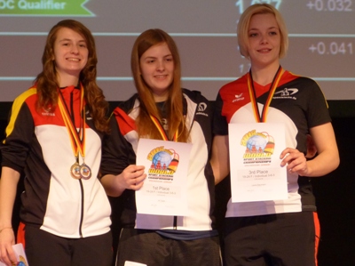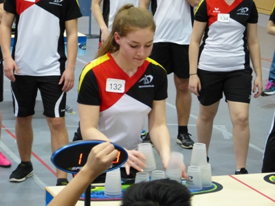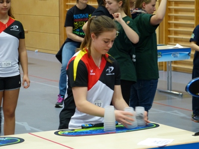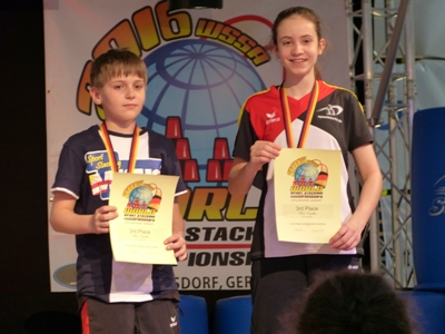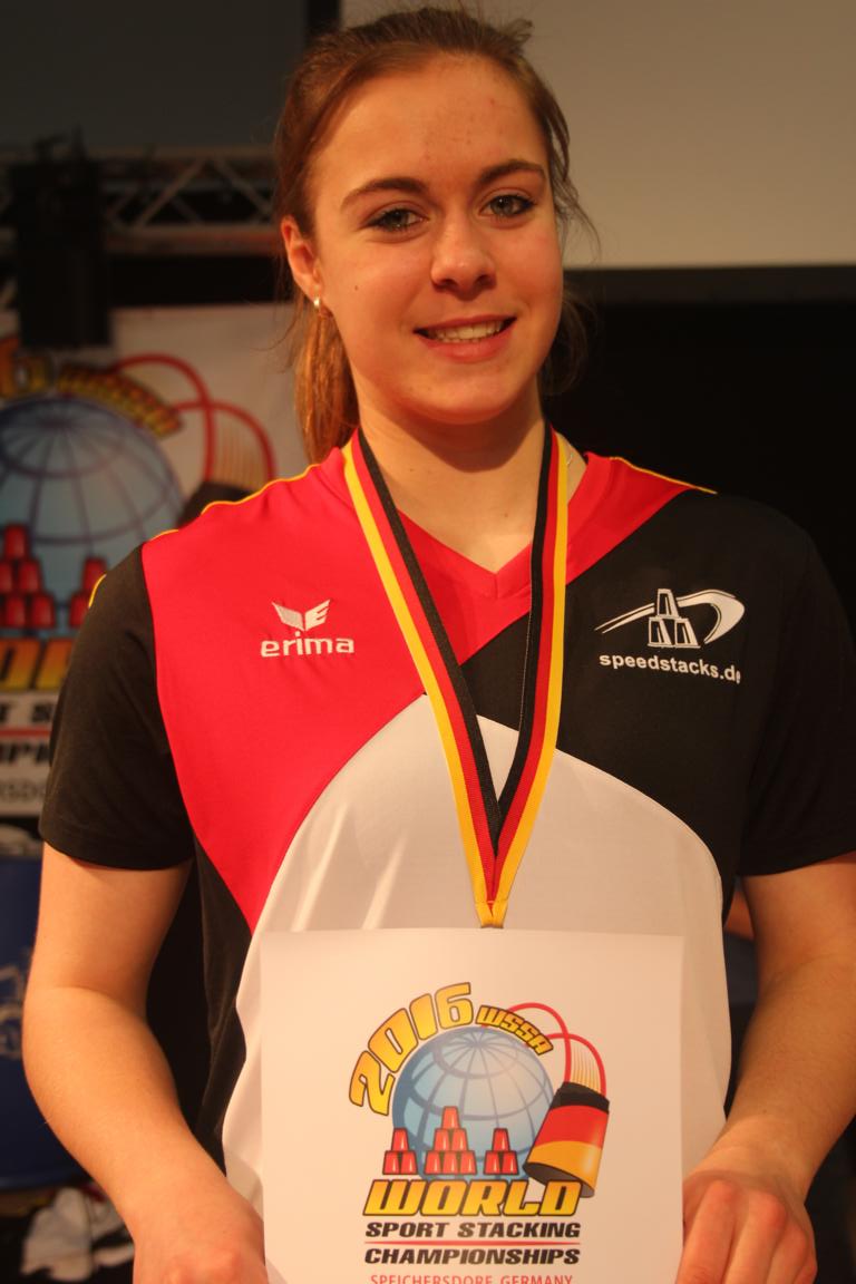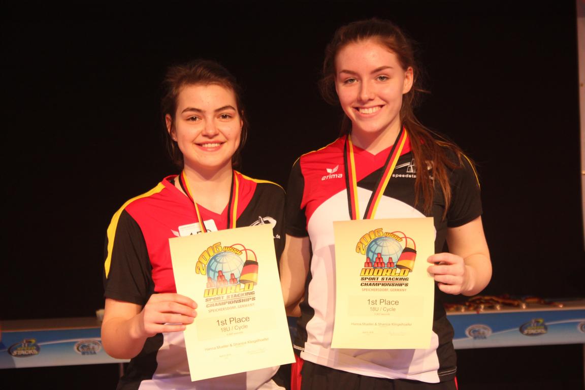 Groß war das Teilnehmerfeld auch bei den 16jährigen Mädchen, Marie Henrich und Shanice Klingelhöfer konnten sich aber auch für alle Finals qualifizieren. Nach einem sehr guten Start in 333 landete Shanice mit 1,853 sec. auf Platz 4, Marie schaffte sehr gute 1,786 sec. und gewann Silber hinter Katarzyna Rodzach aus Polen (1,749 sec.). In 363 gelangen Shanice sehr gute 2,385 sec., was aber wiederum nur für Platz 4 reichte, Gold ging mit 2,260 sec. an Aimee Dumigan-Smith aus England. Marie musste volles Risiko eingehen, um an diese Zeit hernazukommen, bleib dadurch aber nicht fehlerfrei und wurde Siebente. Im Cycle gelang beiden SST-Stackerinnen kein fehlerfreier Versuch, so dass sich Lia Ziegler aus Speichersdorf mit 6,933 sec. über den Titel freuen durfte. Im Doppel belegte Marie zusammen mit Finja Hollin Platz 4, Shanice stackte an der Seite von Hanna Müller erstmals unter 7 Sekunden, was den beiden den Weltmeistertitel einbrachte. Ihre Siegerzeit von 6,897 sec. war zugleich die drittschnellste Doppelzeit des gesamten WM-Turniers.