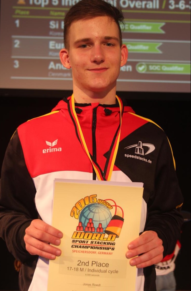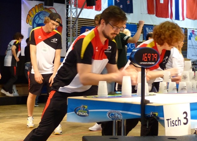 Bei den 17/18jährigen Jungen war mit William Orrell der Weltrekordhalter aller Klassen am Start. Er traf unter anderem auf den deutschen Ausnahmestacker Son Nguyen und Jonas Rödl vom SST Butzbach. In 333 und 363 ließ William seine Extraklasse aufblitzen und gewann mit 1,455 bzw. 1,888 sec. jeweils vor Son (1,656 bzw. 2,114 sec.). Jonas zeigte sich in blendender Verfassung und schaffte 1,809 bzw. 2,284 sec., platzierte sich damit aber "nur" auf den Plätzen 6 und 4. Im Cycle entspann sich eine spektakuläre Entscheidung, als Jonas zunächst 6,580 sec. vorlegte, die bis zu den letzten beiden Stackern nicht unterboten werden konnten. Son schaffte dann 6,083 sec. und setzte somit die Marke für William, der als Vorrundenschnellster zuletzt an den Wettkampftisch gebeten wurde. Nachdem die beiden ersten Versuche nicht gelangen, setzte William im letzten Versuch alles auf eine Karte - und warf bei diesem Tempo einen Becher vom Tisch! Damit wurde Son Weltmeister und Jonas gewann die Silbermedaille! Lukas Drexelius qualifizierte sich für das Finale in 363 und im Cycle und belegte die Plätze 6 und 10. Im Doppel steigerten sich Jonas und Lukas auf 7,336 sec. und schafften damit die fünftbeste Doppelzeit des Tages, wurden aber nur Vierte ihrer Altersklasse.