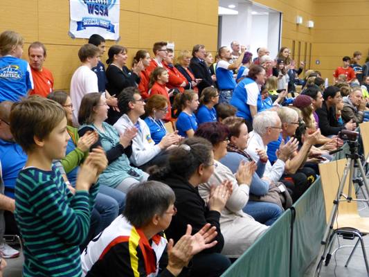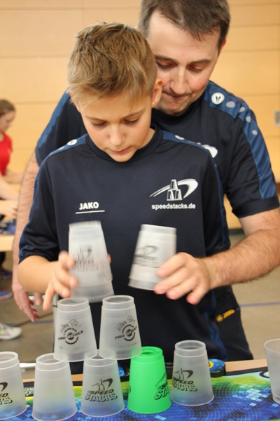 Als erste Finalentscheidungen standen die Eltern-Kind-Doppel auf dem Programm. Aus einer riesigen Zahl von Meldungen konnten sich nur 5 Doppel für das Finale qualifizieren, in dem das Kind älter als 10 Jahre ist. Alle hatten Zeiten unter 10 Sekunden vorgelegt, eine große Leistungsdichte. Als erste starteten die ehemaligen Weltmeister Heike und Dustin Schierholz (Enger) und legten sehr gute 9,397 sec. vor. Danach mussten Mario und Maxi Gemmer vom SST mit einer Vorrundenzeit von 9,754 sec. an den Tisch. Sie starteten sehr gut mit 9,595 sec., was ihnen die nötige Sicherheit für einen risikoreicheren Versuch gab – und sie wurden belohnt: mit 8,425 sec. im zweiten Versuch schafften die beiden einen neuen Weltrekord für diese Altersklasse, der vom Publikum begeistert bejubelt wurde. Robert und Erik Sinkovic (Stockstadt) waren mit 9,064 sec ebenfalls sehr schnell und gewannen Silber. Der Schweizer Karl Fehrenbach hatte mit seinen beiden Töchtern in Führung gelegen, konnte sich mit 9,301 sec. aber nur noch Bronze sichern.