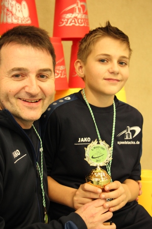 Für die schnellsten Zeiten des Tages aus Sicht des SST Butzbach sorgte einmal mehr Maxi Gemmer bei den 13/14jährigen Jungen. Mit Siegen in 333 in 1,815 sec. und 363 in 2,224 sec. stellte er erneut seine große Wettkampfstärke unter Beweis, danach ließ er im Cycle ausgezeichnete 6,472 sec. folgen, musste sich aber Jannis Joiko vom TV Zuffenhausen geschlagen geben, der sich mit 6,382 sec. noch an Maxi vorbeischob. Mit Vater Mario legte Maxi im Eltern/Kind-Doppel tolle 8,887 sec. vor, die von keinem der nachfolgenden Doppel mehr erreicht werden konnte, so dass die beiden den Siegerpokal für diese Disziplin entgegennehmen durften.