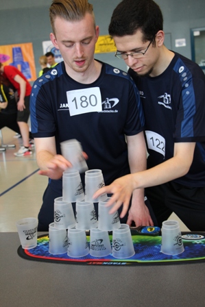 Einen wahren Durchmarsch legten die SST-Stacker Ruben Kehl und Mohammed Sahraoui bei den Masters 1 (25-34 Jahre) hin, denn Ruben gewann alle Einzeldisziplinen und Moha wurde jeweils Zweiter. Beflügelt durch diese Erfolgsserie stapelten die beiden zusammen im Doppel mit 8,620 sec. sogar einen neuen Weltrekord für diese Altersklasse. Boris Konrad kämpfte vehement gegen die jüngere Konkurrenz, musste sich aber mit zwei vierten und einem fünften Platz begnügen. Freuen konnte sich alle SST-Stacker zusammen über einen neuen Weltrekord in der 363-Zeitstaffel gemeinsam mit Rebecca Ernst und Timo Böhm vom TSV Achim.