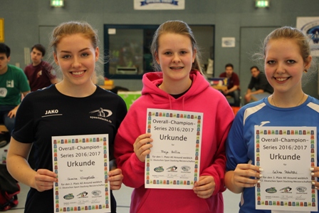 Manuel Schichau war mit seinen Finalplatzierungen im Mittelfeld der AK 15/16 Jahre, zu der viele der schnellsten Stacker des gesamten Turniers zählten, nicht ganz zufrieden, freute sich dann aber umso mehr über den Titel im Doppel dieser AK an der Seite von Alexander Sinkovic, den sie mit guten 8,164 sec. unter Dach und Fach brachten. Bei den 17/18jährigen Mädchen vertraten Shanice Klingelhöfer und Marie Henrich die Farben des SST Butzbach.