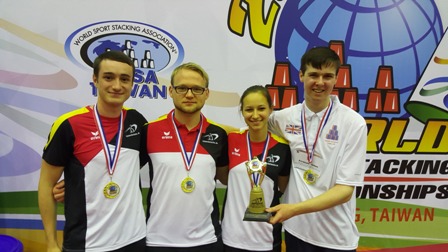 Bei den Sport Stacking Weltmeisterschaften in Kaohsiung / Taiwan waren für Team Germany 38 Sportlerinnen und Sportler am Start und gewannen 28 Weltmeistertitel. Unsere Bilder zeigen das gesamte deutsche Team sowie die Staffel der Collegiates mit (v.l.) Leon Reuhl (SST Butzbach), Alexander Balz, Veronika Doser und James Acraman, die dreifache Weltmeister wurden. Weitere Titel für das SST gewannen Mohammed Sahraoui und Boris Konrad (vgl. Bericht).